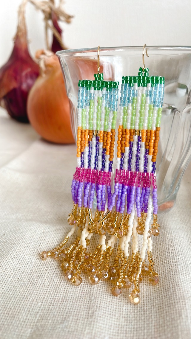 ご覧いただきありがとうございます。 こちらはハンドメイド作品です。 デザインのテーマ【ギンガム:夏野菜】 お茄子にピーマンきゅうり じゃがいもにトマト、 とうもろこし! カラフルよねぇ〜 みずみずしくてだーいすき♡ だからといって… ニットに似合わないわけでもないのです。 長さ:約10センチ 重さ:約8g ピアス金具:金メッキ 【注意事項】 ご購入後の返品は承っておりません。ハンドメイドである特性上、神経質な方はご遠慮ください。 ※ピアス(金メッキ)を基本としています。 イヤリングご希望の場合、別注となりますのでお問い合わせください。 ※ 一本の糸で細かなビーズを編み付け、ぶら下げているので 強く引っ張ったりすると破損する可能性があります。 取り扱いにはご注意ください。 ※ サイズの誤差やビーズのばらつきが ある場合もございます。予めご了承ください。 *** 【Tシャツ×デニムが“自分らしいオシャレ”に。唯一無二のビーズピアス】 シンプルなTシャツとデニムのコーディネートに、 ひとつプラスするだけで一気にオシャレに♡ そんな“主役級”の存在感を持つピアスを目指して、デザインしました。 派手めでボリュームのあるフォルム、 そして個性的な色合わせが特徴です。 私自身もつけていると、ほぼ毎回「オシャレなピアス!」と言ってもらえます♡ 自由な感性で組み合わせたミユキビーズやガラスビーズをたっぷり使い、 デザインから、ひと針ひと針編み進めて仕上げるまで、丸1日以上かかる 手間ひまを惜しまない一点ものの作品です。 「ちょっと高いかも」と思われるかもしれません。 でも! 他にはないデザイン・配色・質感を、 あなたの日常をグレードアップしてくれるアクセサリーとして 楽しんでいただけたら嬉しいです。