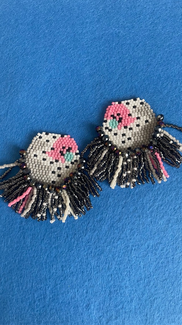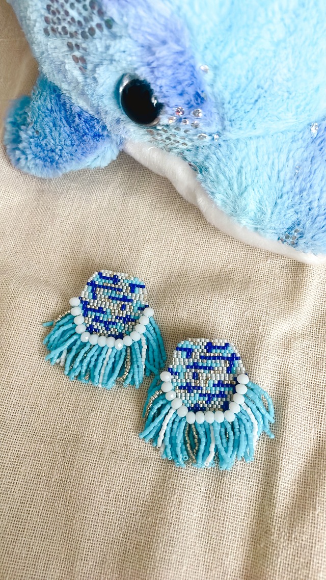 【クラゲ】 ご覧いただきありがとうございます。 こちらはハンドメイド作品です。 デザインのテーマ【クラゲ】 水族館ではもう 一日中見てても飽きないクラゲ。 ミズクラゲがだいすき! 動きも色味も形も 全部がかわいくて癒し。 綺麗な色のライトに照らされて いろんな色に変化するのも いいよねぇ♡ すでにお嫁入りしてる クラゲがいるんだけど、 なんと霧ヶ峰に行ったぜ! 水の中だけじゃない、 山にだって行ける クラゲでございます。 長さ:約5cm(金具込み) 重さ:約7g ピアス金具:金メッキ 【注意事項】 ご購入後の返品は承っておりません。ハンドメイドである特性上、 神経質な方はご遠慮ください。 ※ピアス(金メッキ)を基本としています。 イヤリングご希望の場合、 別注となりますので お問い合わせください。 ※ 一本の糸で細かなビーズを編み付け、 ぶら下げているので 強く引っ張ったりすると 破損する可能性があります。 取り扱いにはご注意ください。 ※ サイズの誤差やビーズのばらつきが ある場合もございます。 予めご了承ください。 *** 【Tシャツ×デニムが“自分らしいオシャレ”に。唯一無二のビーズピアス】 シンプルなTシャツとデニムの コーディネートに、 ひとつプラスするだけで一気にオシャレに♡ そんな“主役級”の存在感を持つ ピアスを目指して、デザインしました。 派手めでボリュームのあるフォルム、 そして個性的な色合わせが特徴です。 私自身もつけていると、ほぼ毎回 「オシャレなピアス!」と言ってもらえます♡ 自由な感性で組み合わせた ミユキビーズやガラスビーズをたっぷり使い、 デザインから、ひと針ひと針編み進めて 仕上げるまで、丸1日以上かかる 手間ひまを惜しまない一点ものの作品です。 他にはないデザイン・配色・質感を、 あなたの日常を グレードアップしてくれるアクセサリーとして 楽しんでいただけたら嬉しいです。